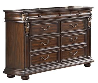 Le riche fini cerisier met en valeur le grain distinct des placages de cerisier à la perfection, tandis que le cadre robuste en bois dur de peuplier vous offre la durabilité nécessaire pour résister à l'épreuve du temps. Les trois tiroirs supérieurs, plus petits, sont dotés de boutons en laiton et sont doublés de feutre pour vos accessoires délicats, tandis que les six tiroirs plus grands, dotés de poignées en forme de goutte d'eau, offrent beaucoup d'espace pour les articles de chambre plus volumineux. Les éléments classiques tels que les détails encadrés et les pieds tournés imprègnent l'Othello d'un charme vintage, vous invitant à embrasser la nostalgie d'un luxe traditionnel chaque nuit.