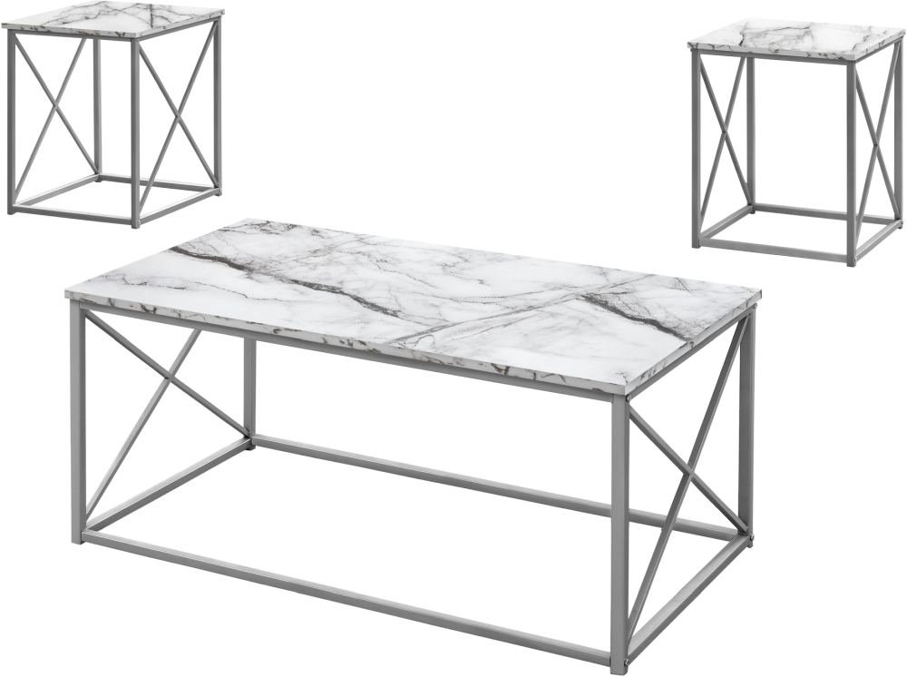 Ce magnifique ensemble de 3 pièces de tables de salon sera bientôt le point focal de votre salon. Incluant une table basse rectangulaire et deux tables de bout, l'ensemble est doté d'un tablier lisse fini faux marbre blanc, rehaussant votre décor de salon comme jamais avant.En savoir plus