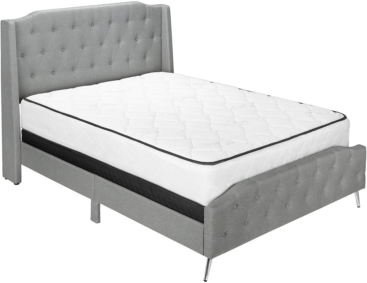 Ce grand lit est recouvert d'un tissu d'apparence lin de couleur gris qui est appliqué avec un rembourrage en mousse et un élégant capitonnage sur la tête de lit légèrement arquée et le pied de lit pour un attrait opulent.En savoir plus