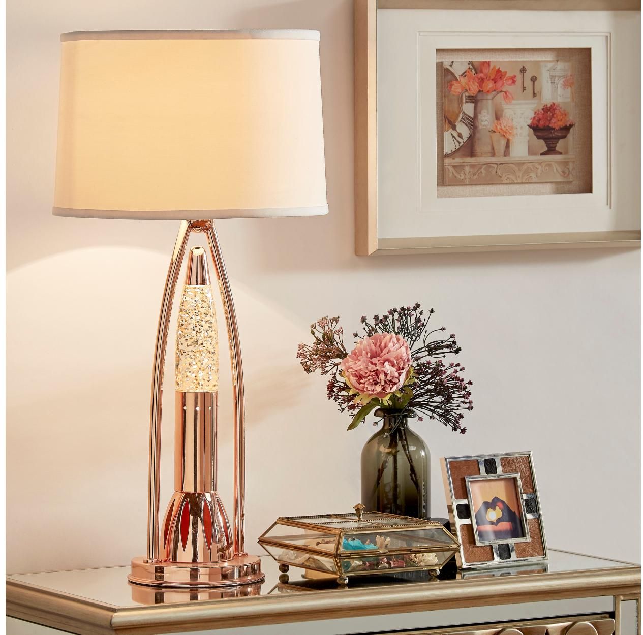 Cet éclairage d'appoint peut changer l'ambiance de n'importe quelle pièce. Son design ultra moderne met en valeur une lumière d'ambiance décorative étincelante, avec de minuscules gouttelettes d'eau ondulantes qui simulent le mouvement apaisant de l'eau dansante. Le support magnifiquement fabriqué est composé de métal et de verre de haute qualité à finition cuivre chromé, et d'un élégant abat-jour circulaire. Cette lampe est idéale pour compléter une table de chevet, une table d'appoint ou une table de canapé. Elle offre une solution d'éclairage flexible : une lampe de table avec une lumière principale qui convient à la lecture, parfaite comme veilleuse, et pour créer une ambiance dans n'importe quelle pièce.En savoir plus