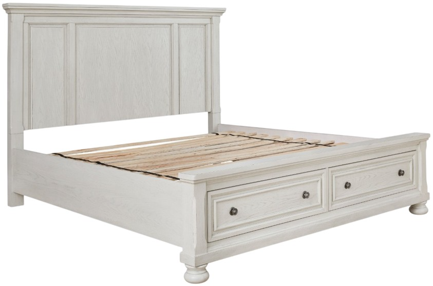 Un mobilier élégant et intemporel rehausse le style de votre chambre à coucher. Rien ne vaut ce lit à panneaux avec rangement. La finition blanche vieillie avec une magnifique texture grainée rayonne de sophistication, tandis que les ferrures bronze foncé ajoutent une touche décorative aux tiroirs de rangement pratiques.En savoir plus