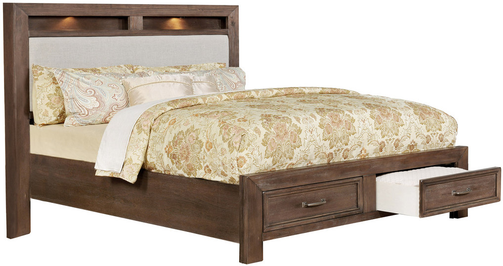 La tête de lit contient deux recoins peu profonds accueillant des lumières DEL ainsi qu'un panneau rembourré en tissu neutre clair