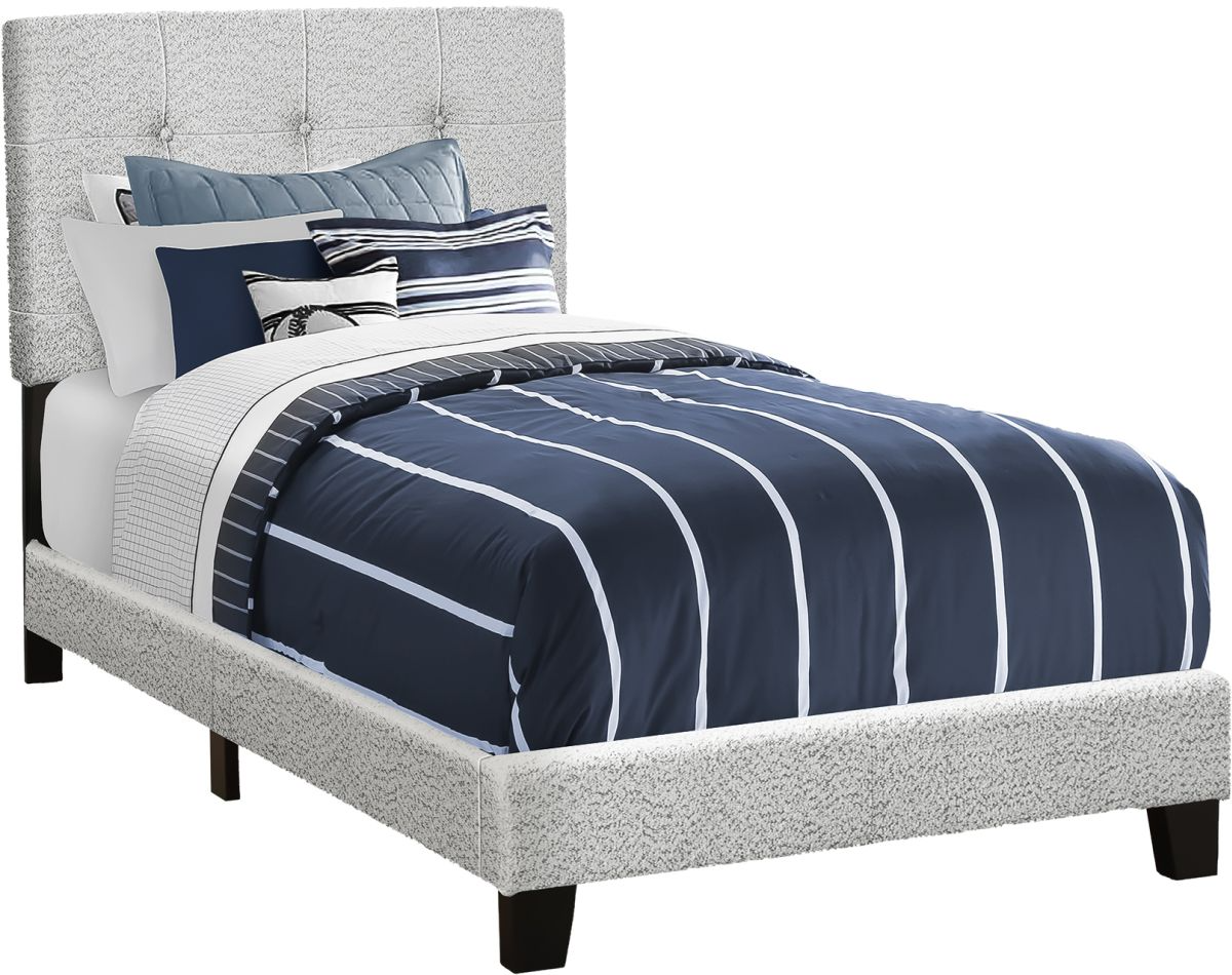 Créez un espace de chambre à coucher à la mode pour un jeune avec ce cadre de lit à la mode pour deux personnes, en tissu bouclé gris clair et pieds en plastique noir. Ce lit rembourré de style transitionnel est conçu avec une tête de lit rembourrée classique à boutons pour un soutien confortable.En savoir plus