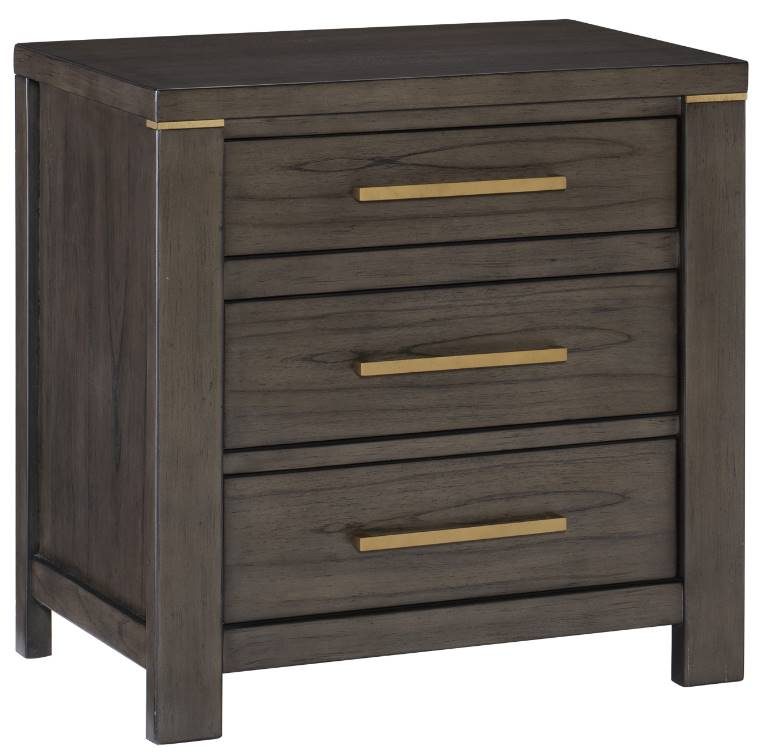 Le profil moderne et élégant de la collection Scarlett sera le complément parfait de votre chambre à coucher. Le bois massif de cajou et le placage de mindy sont finis dans un gris brunâtre avec une quincaillerie et une bande d'accentuation finies en or, ce qui donne un contraste subtil au profil de la table de nuit.En savoir plus
