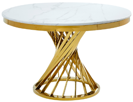 Au lieu d'un piédestal solide, la base est composée de nombreuses barres métalliques dorées qui brillent en s'élevant doucement en spirale pour soutenir le plateau de la table. La surface ronde de la table présente une finition réaliste en faux marbre blanc sur de la pierre véritable pour une expérience tactile convaincante qui combine le poids froid du marbre véritable avec une surface laminée non poreuse qui est plus facile à nettoyer. Imprégnée de profondeur et de dynamisme, la table Venus est un ajout enchanteur à votre salle à manger contemporaine.