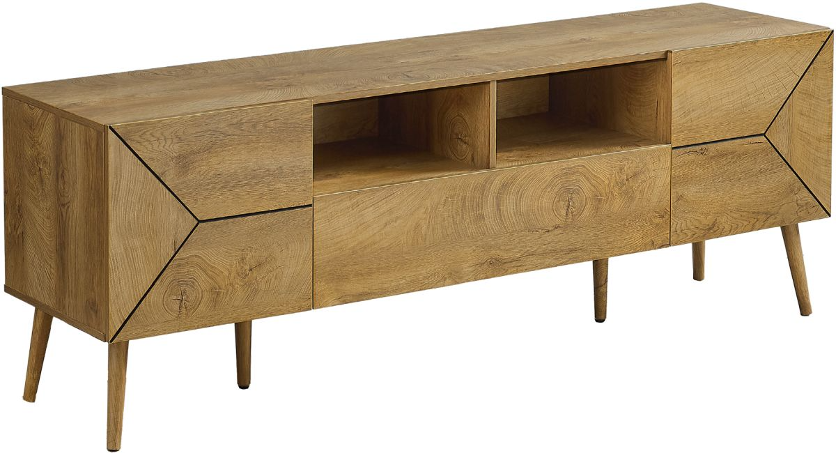 Il comprend un grand tiroir de rangement à glissement facile, 2 compartiments ouverts et 2 armoires de rangement accentuées par des lignes rainurées élégantes pour tous vos besoins en matière de rangement pour les médias et les divertissements.