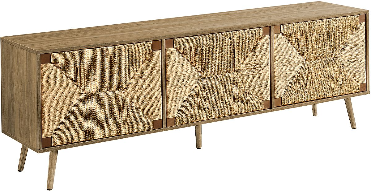 D'inspiration mid-century modern, ce meuble TV de 72 pouces de long en finition stratifiée noyer clair est rehaussé d'un matériau naturel de type seagrass sur les portes de l'armoire pour une ambiance décontractée et chic