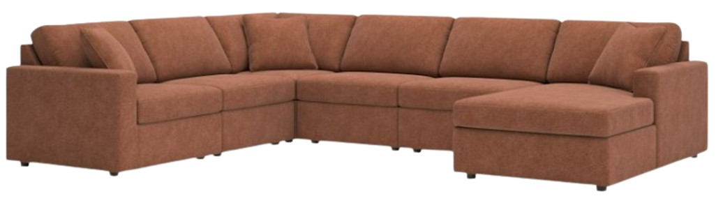 Delivers roomy, flexible seating via six modular pieces chaise, armless chairs, wedge, and storage-capable chaise. Its cushions are loose and reversible for comfort and easy upkeep. The integrated chaise and modular layout adapt to varying living spaces. Throw pillows are included for added comfort.Read More