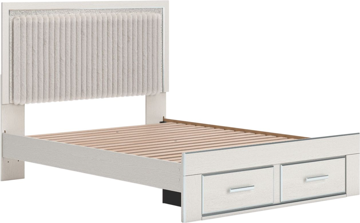 If glitz and glam are your jam, you’re gonna love this queen upholstered panel storage bed. Gleaming glitter and dazzling chrome-tone touches wow with a sophisticated tufted gray faux fur for a stunning pop of pizzazz. Spacious storage drawers with large-scale handles sporting faceted details don’t disappoint.Read More