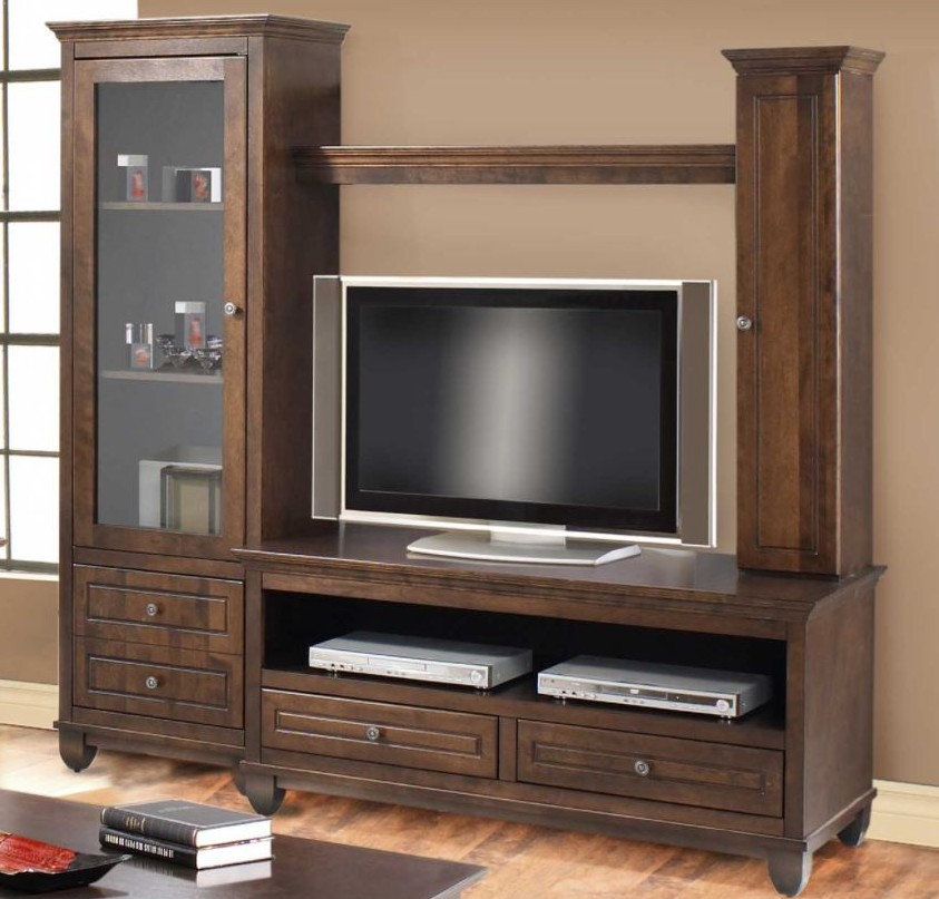 L'unité murale présente une finition en placage de merisier avec une façade en merisier massif, une base télé avec deux tiroirs, une armoire latérale avec une porte en verre et deux tablettes réglables, un pont et une tour CD avec une porte et deux tablettes réglables.Read More